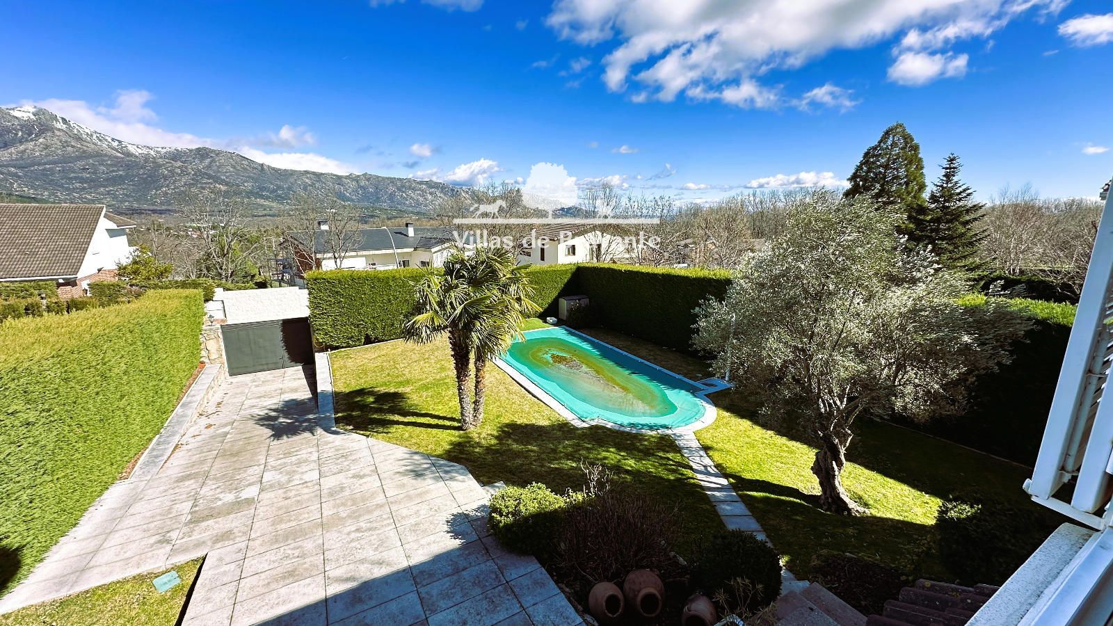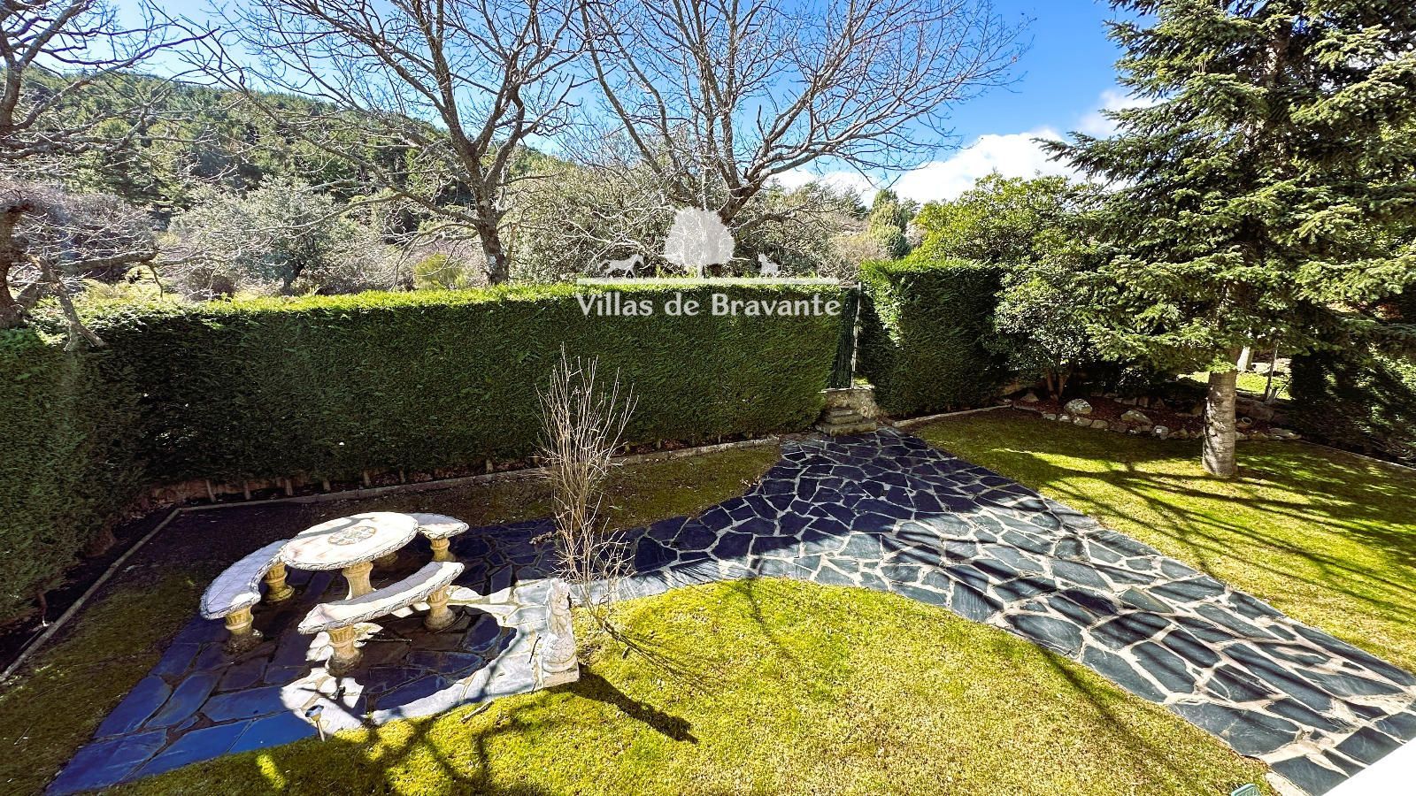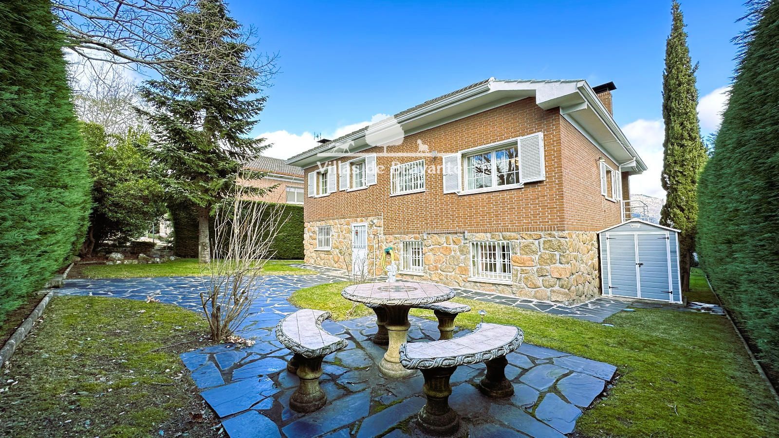 La parcela, con orientación Noreste-Suroeste, ofrece un jardín consolidado y muy privado, con césped natural, arbolado, alumbrado exterior y una piscina de 8 x 5 metros que convierte el exterior en un auténtico oasis. El jardín trasero, con mesa y bancos de piedra, aporta un encanto especial y conecta directamente con caminos y senderos hacia la Sierra de Guadarrama, perfectos para disfrutar de la naturaleza.
