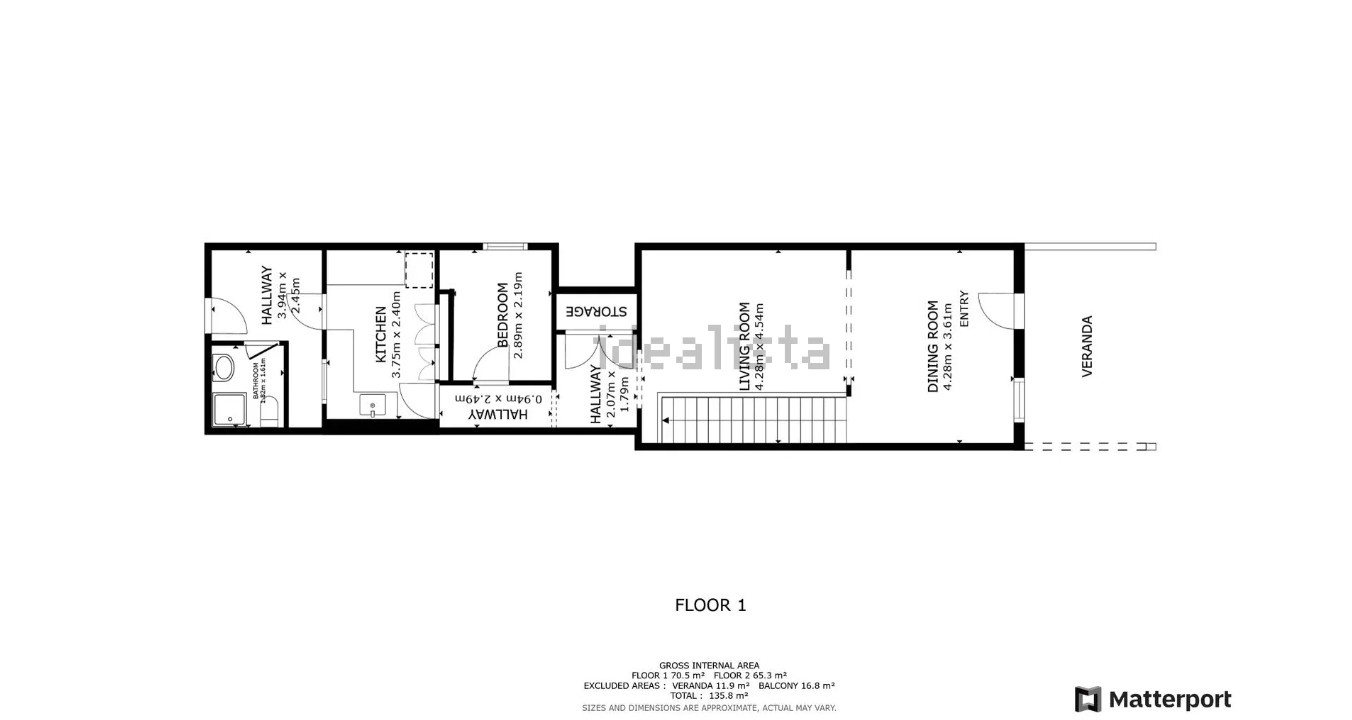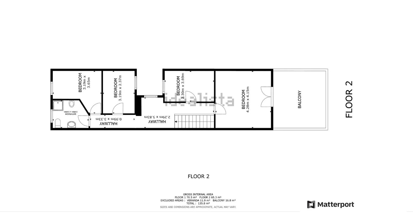La escalera evoca a una cubierta de barco, gracias a su pasamanos de madera y cuerda gruesa en ribete. El desembarco de la escalera se sitúa en el centro de la planta primera, manteniendo una amplitud visual a ambas fachadas de la casa, cuarto principal mirando al mar y amplio cuarto de baño con ventanas mirando a la fachada trasera, cuyas vistas dan a un solar y calle paralela, sin tener ningún edificio pegado. Por la tarde, la luz del oeste entra por todas sus ventanas y patio trasero.