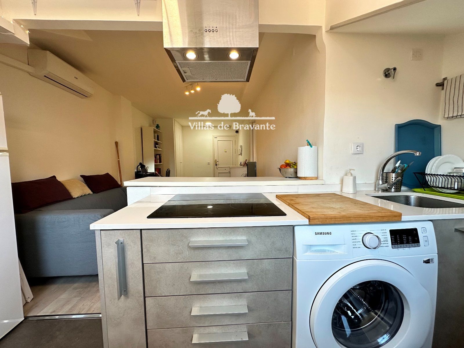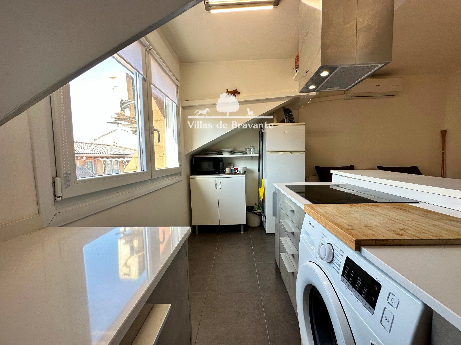 La vivienda ha sido reformada, ventanas nuevas de PVC y Climalit 6/12/6 oscilobatientes y persianas. Con suelo en tarima flotante de madera de lama ancha en color roble grisáceo, y cocina abierta, con una acertada barra con taburetes, cocina con encimera de Silestone, vitrocerámica, lavadora nueva y muebles bajos con gran capacidad de almacenamiento.