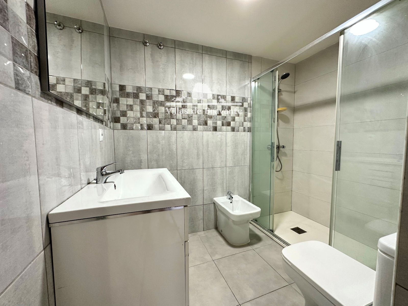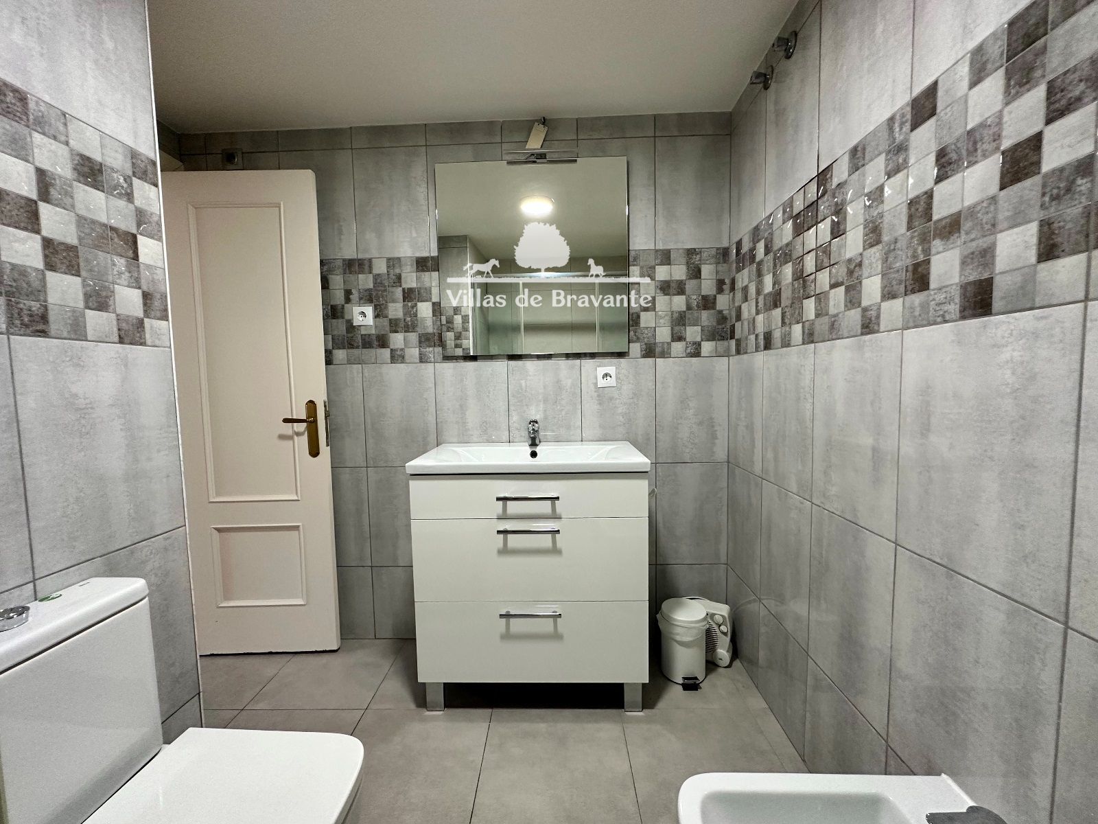 En el interior de la habitación, encontramos el actual cuarto de baño, amplio y completamente reformado, con sanitarios y revestimientos en gres porcelánico de gran formato, ducha de gran tamaño y actual, grifería termostática y mampara corredera de vidrio templado.