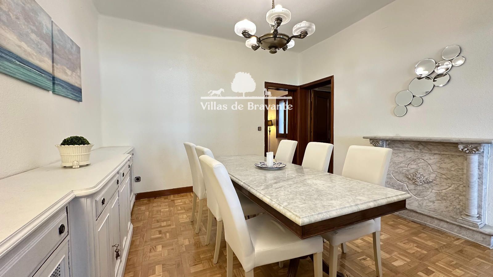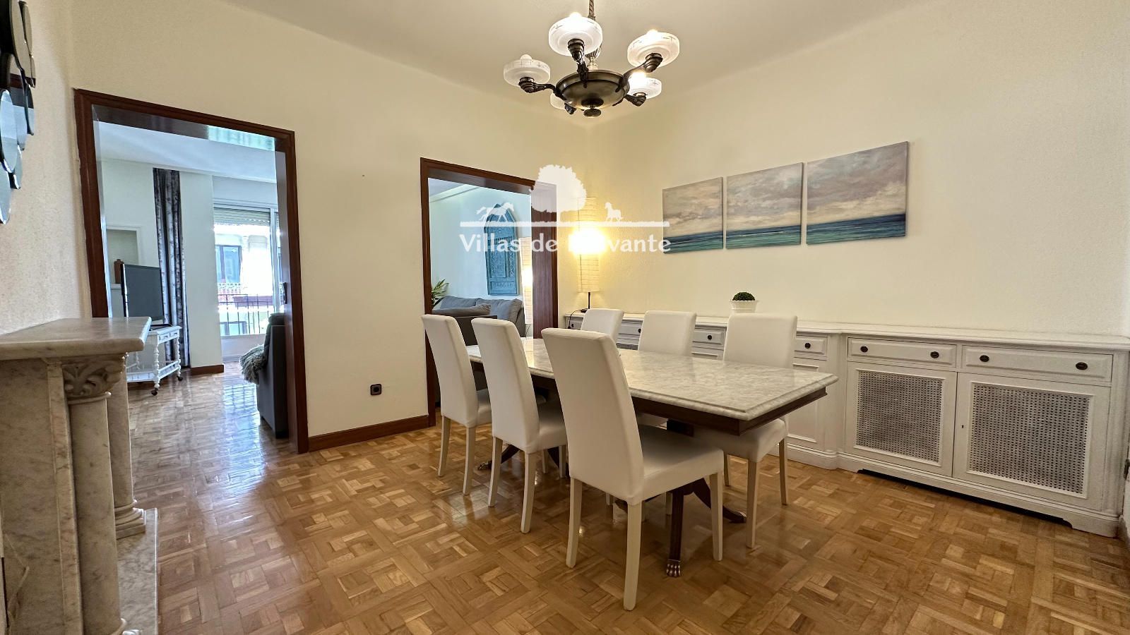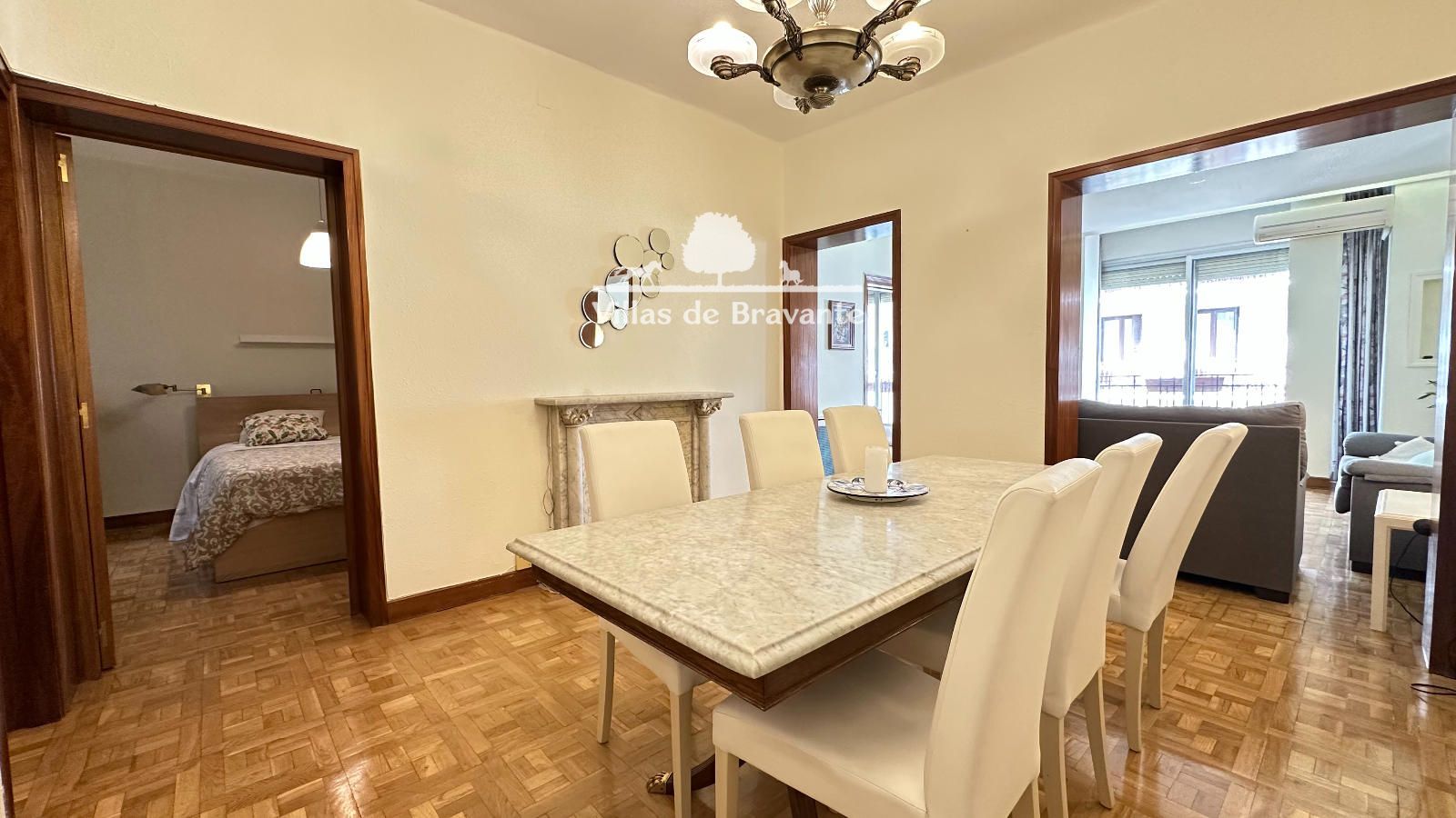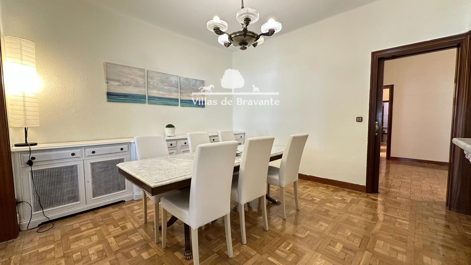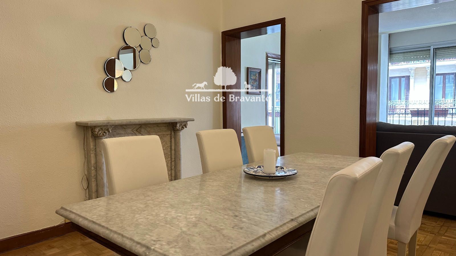 El comedor se separa del salón parcialmente, permitiendo un espacio moderno y elegante. Las paredes de tabiquería de hueco doble (no pladur), y techos altos, permiten una decoración de piezas de mobiliario o cuadros de grandes dimensiones. El suelo, en parquet de roble colocado en dameros, ofrece la calidez y el confort que caracteriza a las viviendas señoriales de Madrid.