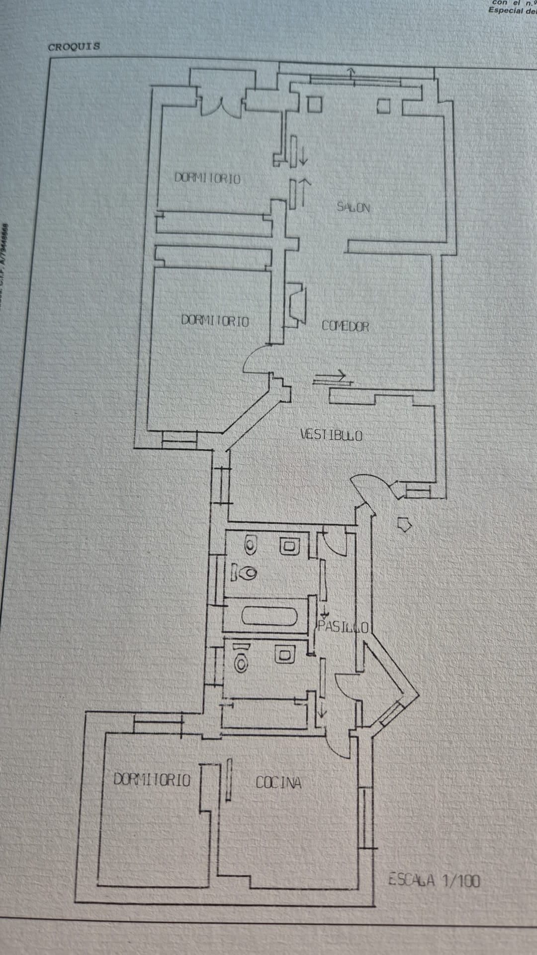 La vivienda se distribuye con un amplio recibidor de entrada, cocina independiente con pequeño cuarto para caldera y tendedero, salón y comedor de muy amplias proporciones, tres habitaciones y dos cuartos de baño, uno con ducha y otro aseo pero originariamente con ducha también, ambos con ventilación natural. Todas las estancias de la vivienda tienen luz natural. Los techos son altos.